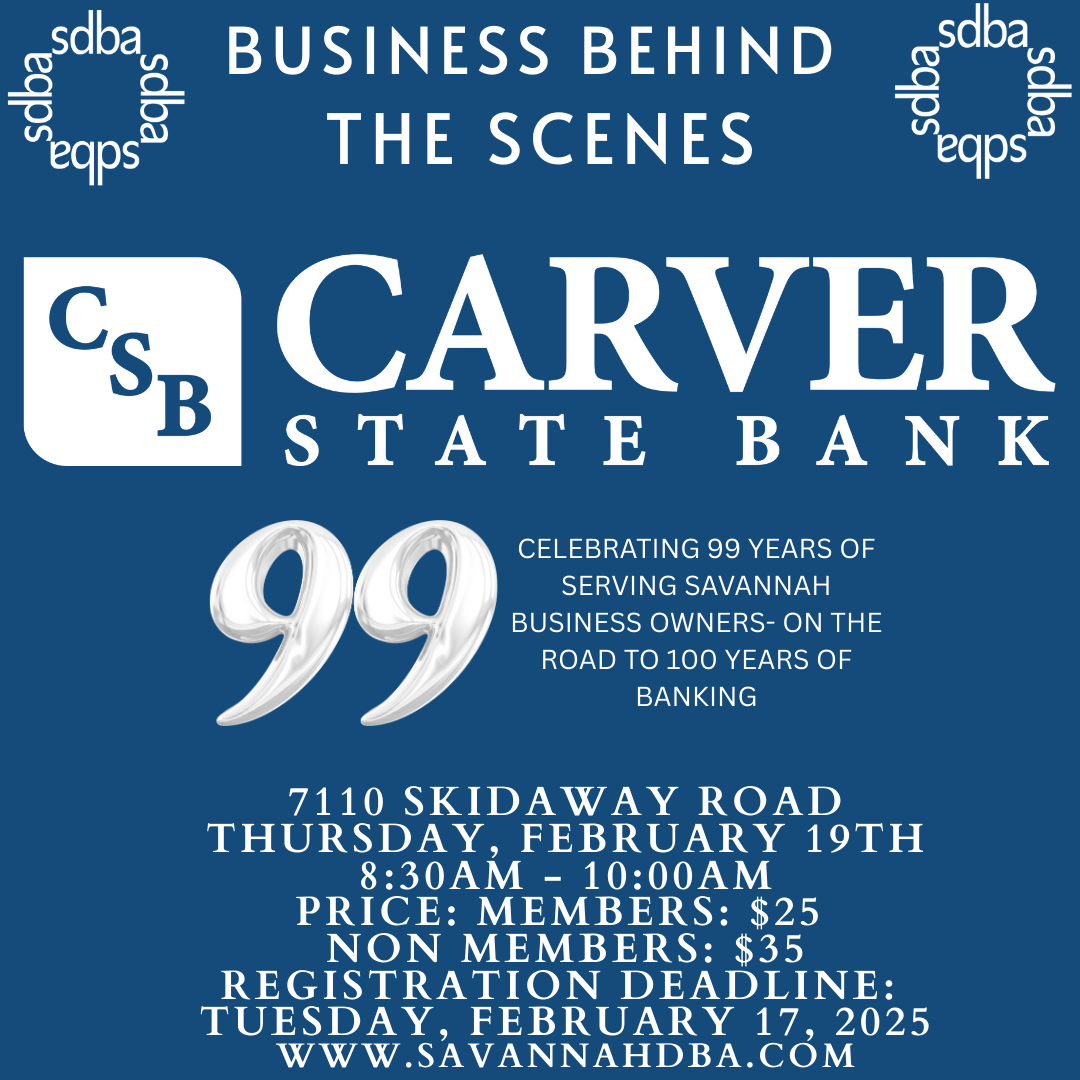 Go Behind the Scenes at Carver State Bank- Register HERE Join the Savannah Downtown Business Association for an exclusive Business Behind the Scenes experience at Carver State Bank—celebrating 99 years of serving Savannah’s business owners and looking ahead to 100 years of banking impact. ✨ What to expect: